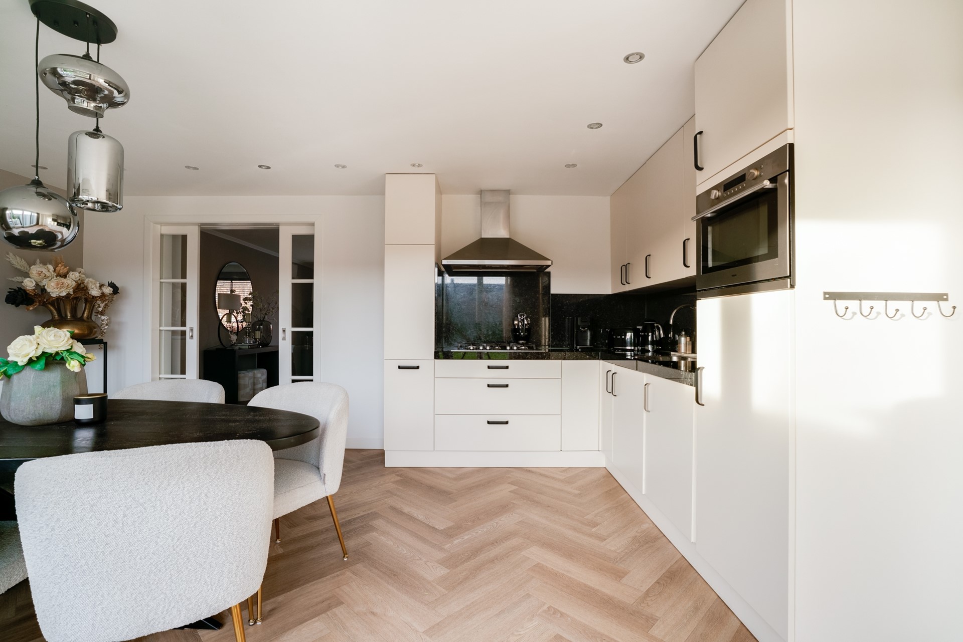 BEGANE GROND: Entree, hal met trapopgang, toilet voorzien van wandcloset met fontein, meterkast, sfeervolle L-vormige woonkamer met visgraad pvcvloer en schuifdeuren naar woon/eetkeuken voorzien van hoek opgestelde inbouwkeuken met rvs afzuigkap, 5pits gaskookplaat, combi-oven, koelkast, vaatwasser en natuurstenen werkblad. De woonkeuken is voorzien van vloerverwarming, airconditioning, toegang tot tuin middels schuifpui met 2 schuifdeuren en doorgang naar garage.