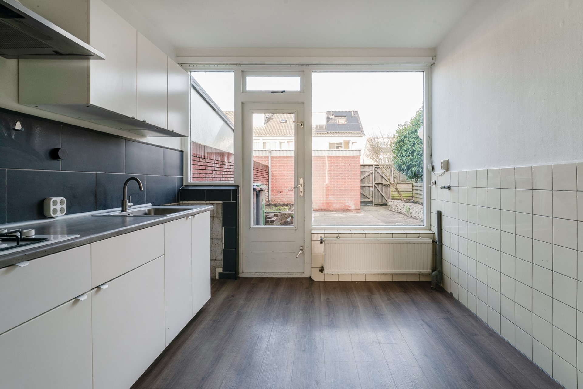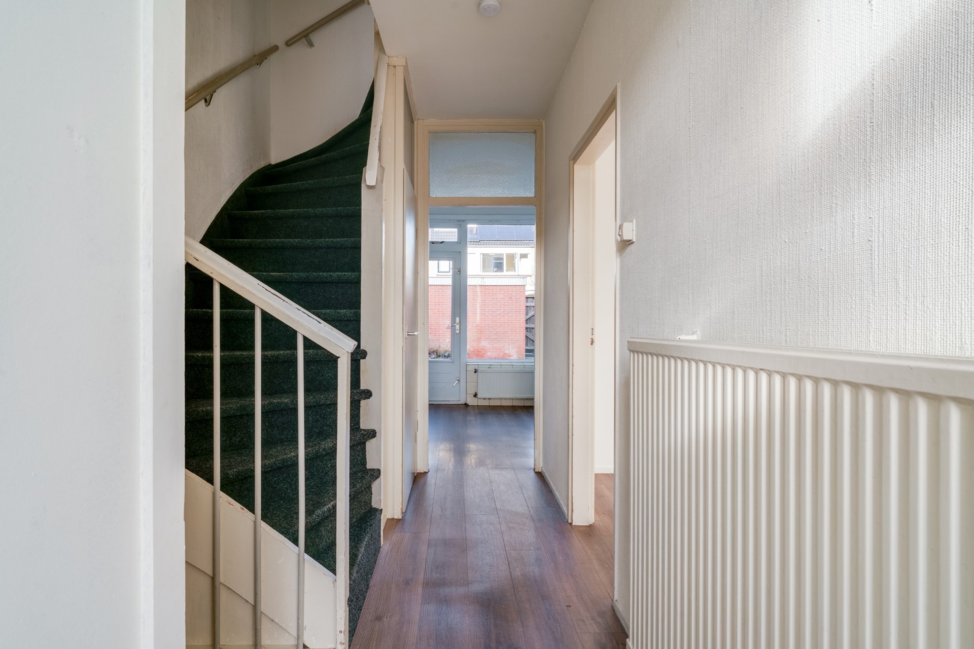 BEGANE GROND: Entree, hal, meterkast, toilet met fontein, trapopgang, trapkast, lichte woonkamer met laminaatvloer, half open keuken voorzien van basiskeukenopstelling, toegang tot tuin.